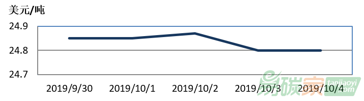 2019年09月30日至2019年10月04日,新西蘭碳市場(chǎng)價(jià)格在24.80-24.87美元/噸之間波動(dòng)。