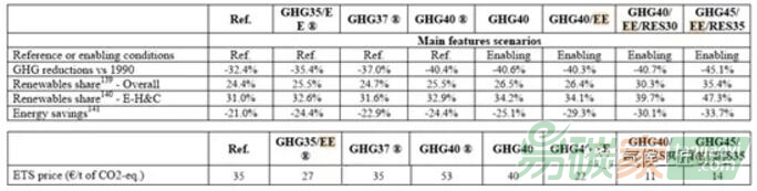 節(jié)能目標(biāo)和補(bǔ)貼等政策手段來(lái)促進(jìn)碳減排。根據(jù)歐盟2014年開展的研究顯示。在2030年同樣的減排雄心下,碳市場(chǎng)的預(yù)測(cè)價(jià)格在沒(méi)有成員國(guó)節(jié)能和可再生能源目標(biāo)下為53歐元,倘若設(shè)立了約束性的30%節(jié)能目標(biāo)和30%可再生能源目標(biāo),碳市場(chǎng)配額價(jià)格僅為11歐元(如表1所示)。碳